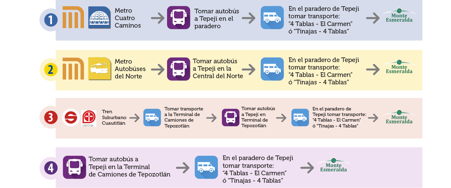 Monte Esmeralda cuenta con una ubicación privilegiada lo que lo convierte en un lugar cercano y con excelente comunicación a municipios como Cuautitlán (Tren Suburbano), Huehuetoca, Tepozotlán, Tizayuca, Tula, Zumpango, asi como el Valle de México.